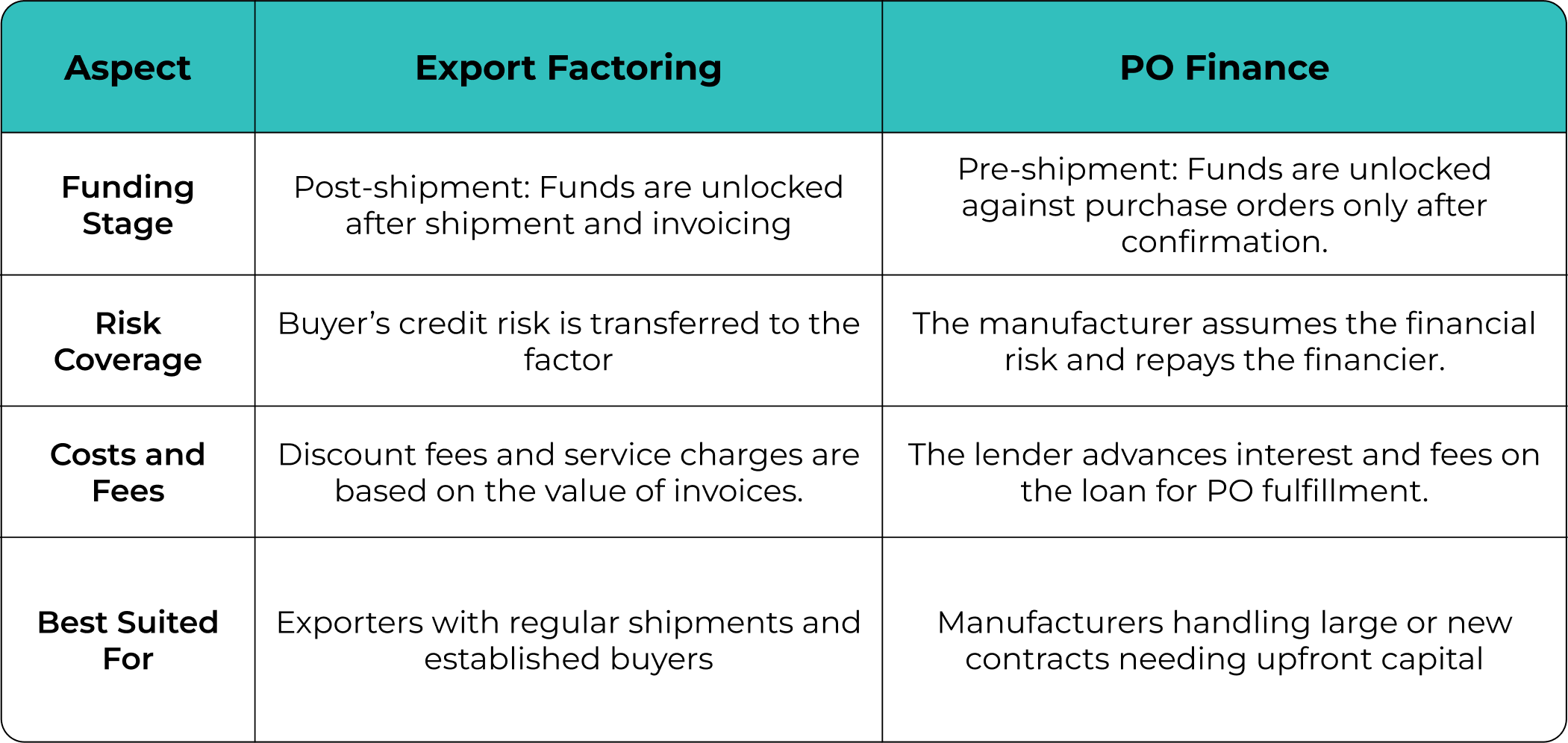 Export factoring suits exporters focused on quick cash flow and credit risk coverage, while PO finance fits manufacturers keen to scale using confirmed but capital-intensive orders.